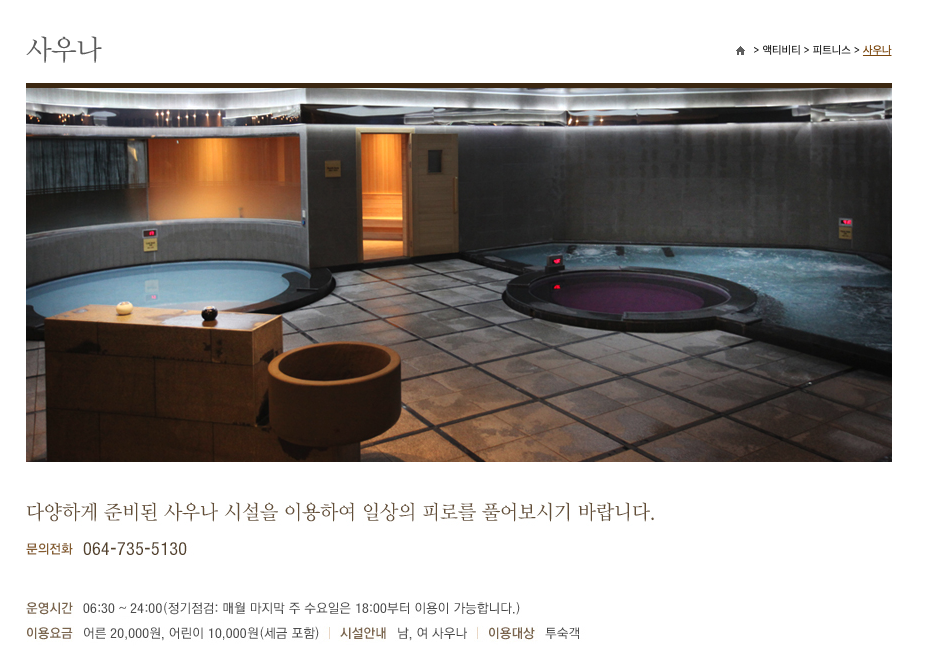사우나 HOME|FACILITIES| 사우나 위치 : 제주 부영호텔 지하 1층 (B1) 운영시간 : 06:30 ~ 21:30 문의 : 064. 731. 5533 (내선 5533) 사우나 정기 보수 공사 안내 사우나 내부의 정기보수공사가 아래 일정 동안 실